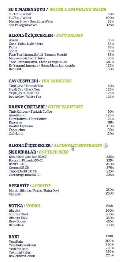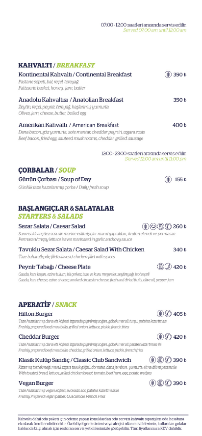 Sunday: 06:00- 11:00 – Until 14:00 late breakfast 600 TL per person.
